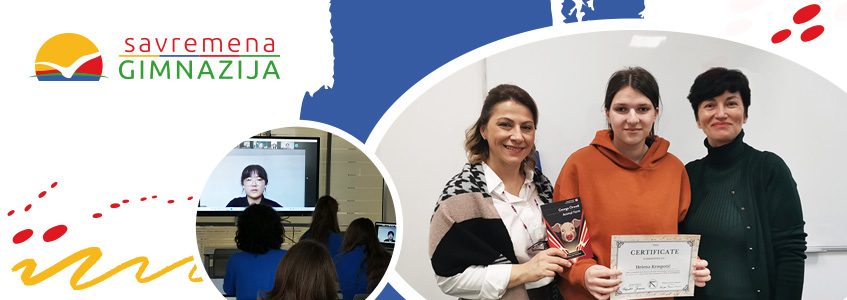 During the first semester, the organisation "Kombinat", as in previous years, announced an international literary competition for original short stories in English. Helena Krmpotić, a student from Savremena Gimnazija from class I-3, won third place in the competition among peers from different countries. Shortly after, Helena was presented with the award by a representative of the "Kombinat" organisation at the premises of Savremena Gimnazija. During that ceremony, the idea was born to connect our students with the students from China through online gatherings, considering that some representatives of "Kombinat" are involved in teaching English in China. In that way, they could exchange ideas and experiences.